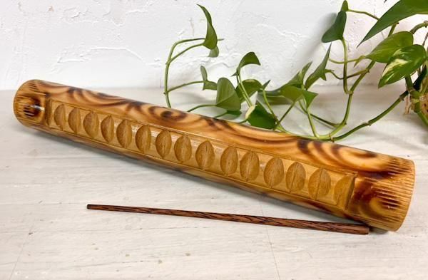 利き手でスティックを、もう片方の手でギロ本体を持って、側面の凹凸をスティックでこすって演奏します。 こすり付けるスピードを変えたり強弱をつけたりして、いろいろなリズムが刻めます。